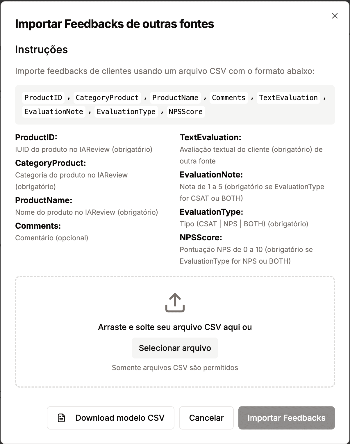 Importe avaliações de outras fontes via CSV e ganhe superpoderes de análise com IA